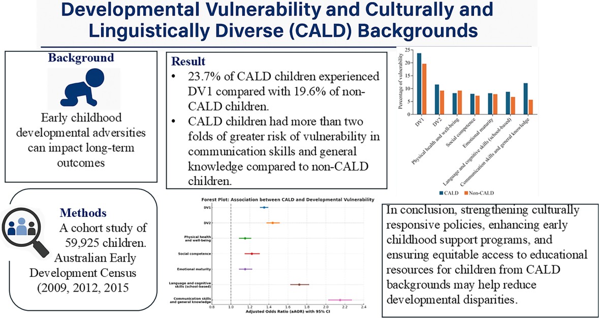 Early childhood is a decisive period that sets the foundation for learning, socialization, and health across the lifespan. Developmental vulnerabilities—such as delays in communication, language acquisition, or social competence—can hinder school readiness and reduce future opportunities. For children growing up in multicultural households, additional challenges often compound these risks. Limited English proficiency, cultural isolation, and socioeconomic stress can make it harder to access early education, healthcare, or supportive networks. Evidence from international studies echoes these patterns, showing that immigrant and minority children frequently face gaps in learning and social development. Because of these challenges, further research is needed to better understand developmental vulnerability among culturally and linguistically diverse (CALD) children.