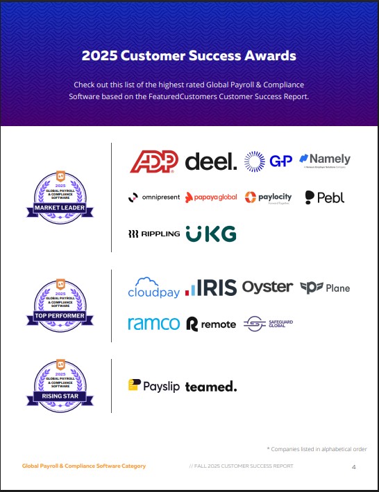 COOPER CITY, FL, UNITED STATES, November 25, 2025 /EINPresswire.com/ -- Today FeaturedCustomers published the Fall 2025 Global Payroll & Compliance Software Customer Success Report to give prospects better insight on which Global Payroll & Compliance Software would work best for their business according to real customer references.