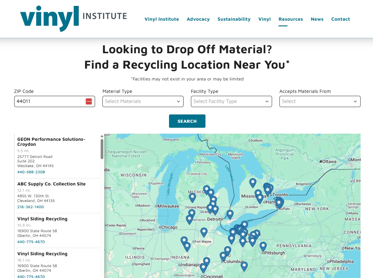 Available at vinylinfo.org/recycling-directory, the tool allows users to search for vinyl recycling collection points by location and product type, helping vinyl materials like siding, piping, and flooring be repurposed into new products rather than ending up in landfills.
